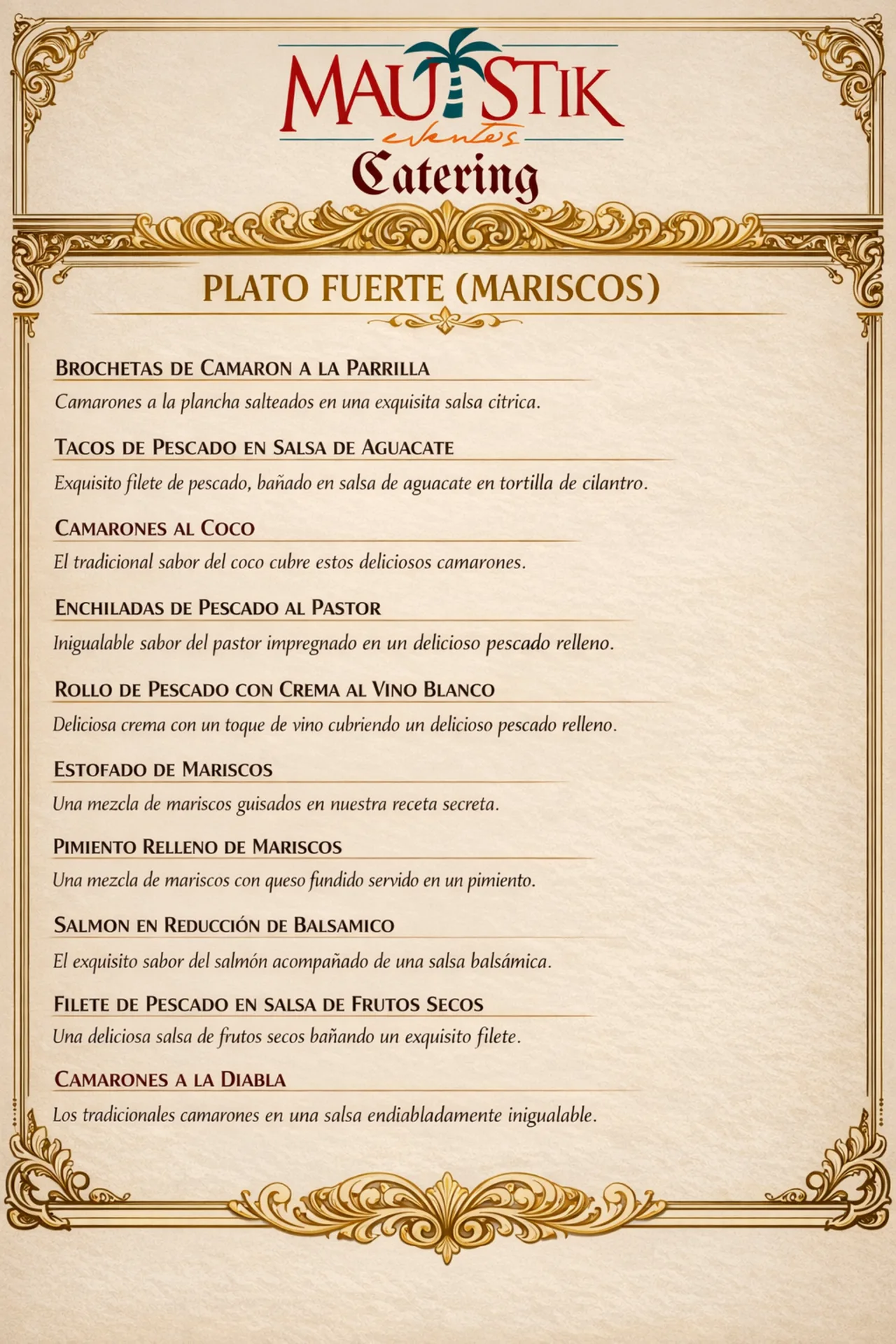 Todos los paquetes incluyen loza y plaqué necesarios para el servicio. Precios con mínimo de 50 personas. Para menos invitados, se cotiza por separado.