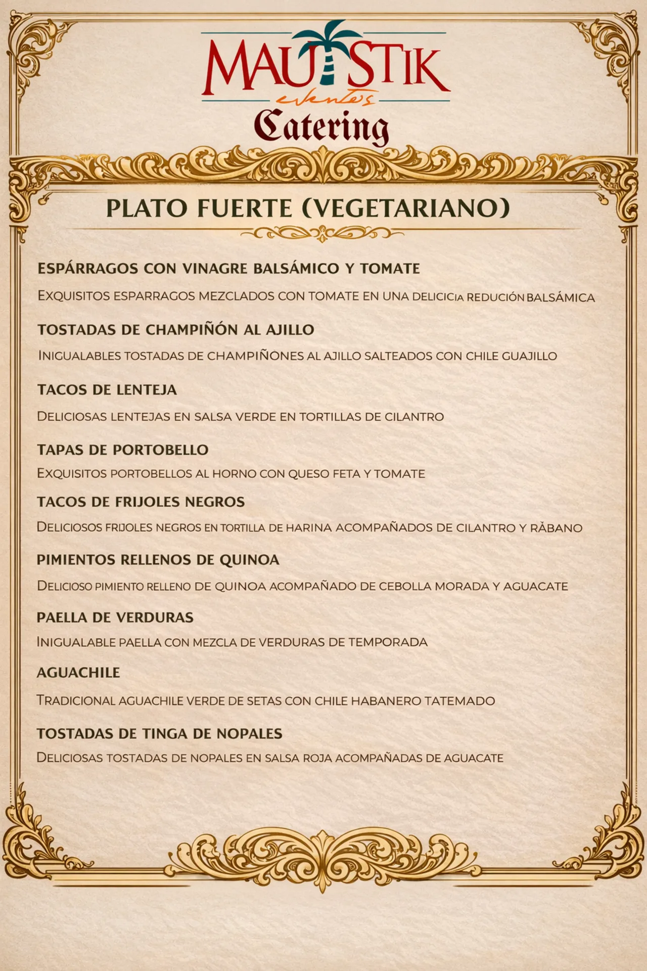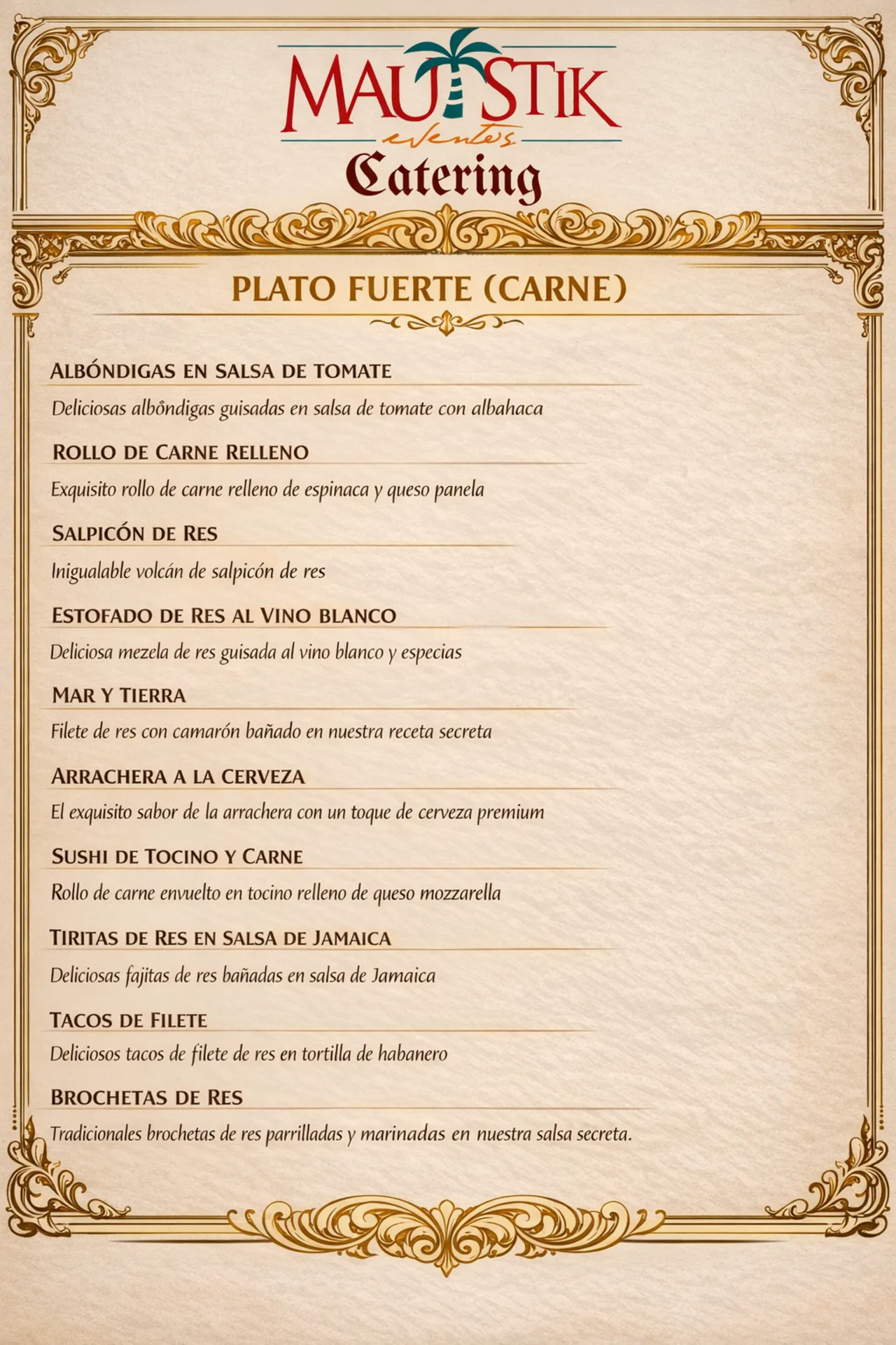 Una experiencia elegante y ordenada: servimos cada tiempo de forma coordinada, cuidando presentación, temperatura y ritmo del evento. Ideal para bodas, graduaciones, cenas corporativas y celebraciones con formato formal.